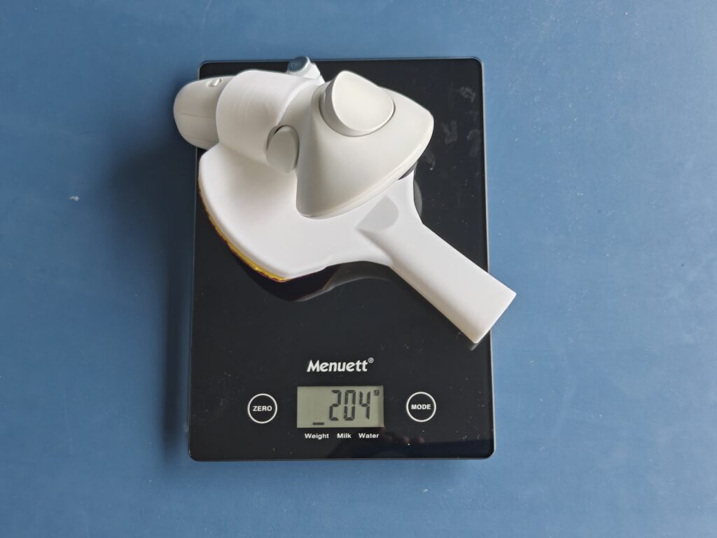 approx. 195g with AAA battery and AAA->AA battery adapter, closely mimicking an actual racket.